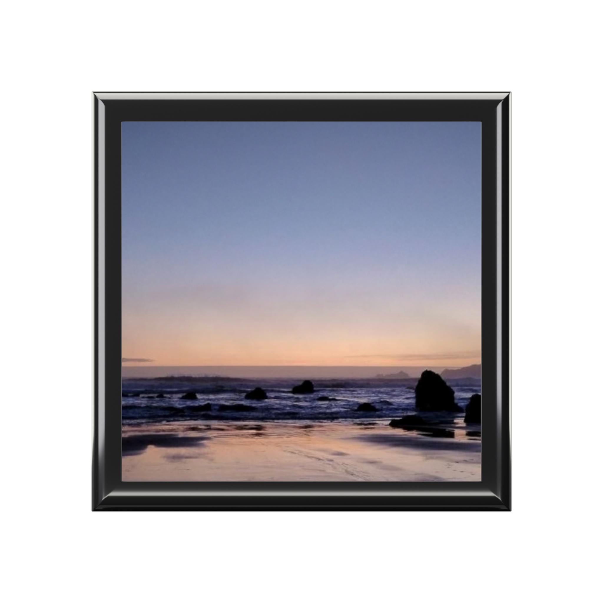 A compact jewelry box inspired by the Oregon coast, designed to hold and display your favorite pieces with quiet care. The warm grain of rubberwood and a glossy varnish echo tides and driftwood, while the ceramic tile on the lid — decorated with a jewel-like coastal design — catches light like sea glass. Open the dual-hinged lid to reveal a soft felt interior that cradles rings, necklaces, and small keepsakes. The slip-resistant felt base keeps the box steady on vanities or bedside tables. It sits easily in a small space but reads like a tiny treasure chest, bringing a coastal moment to everyday rituals and quiet mornings.